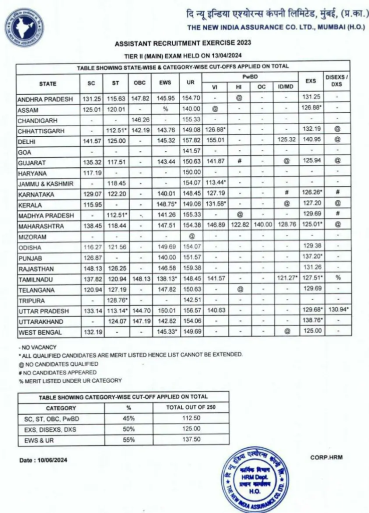 State-by-state and category-by-category NIACL Assistant Mains Cut Off 2023 are provided on the official website, www.newindia.co.in, and are also updated here. Candidates who took the test or intend to take it should review the official cutoff scores from the linked snippet below.